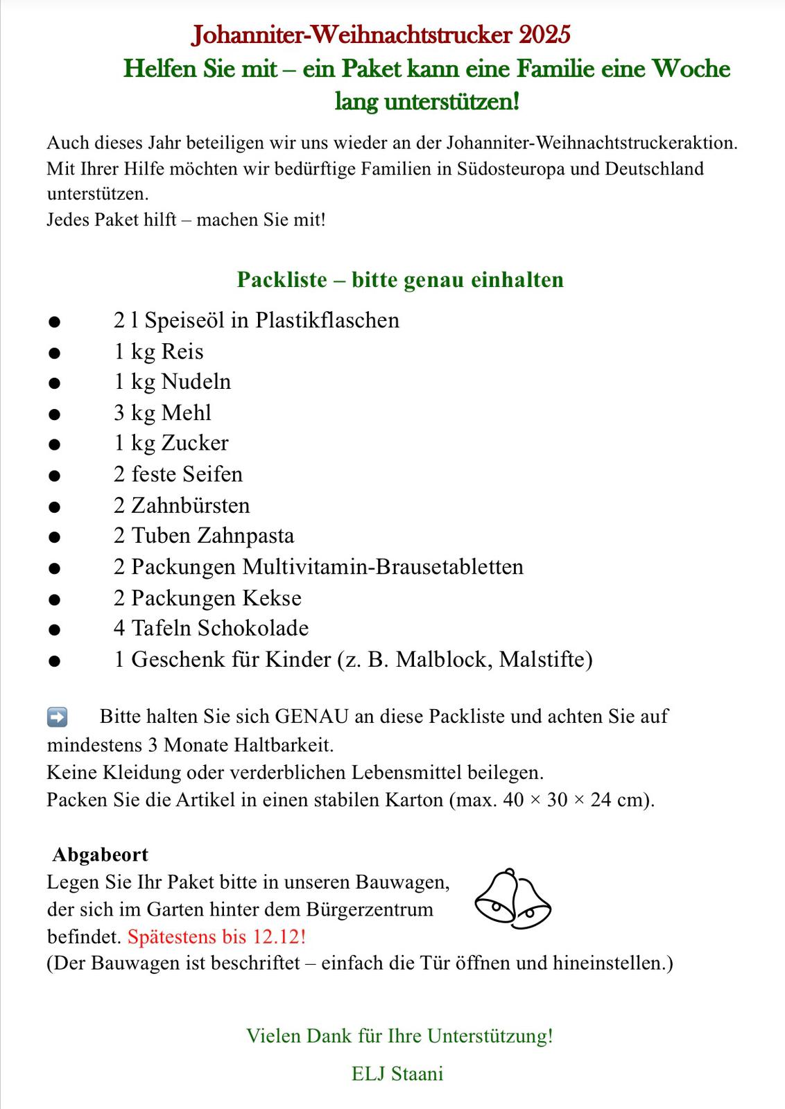 Die ELJ Staani sammelt für die Johanniter Weihnachtstrucker